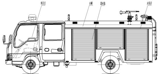 總體布置 | 整車由消防員乘員室和車身兩大部分組成,車身布置采用整體框架式結構,內藏水罐,兩邊為器材箱,后部為水泵房,罐體為平行長方體廂式容罐。 |