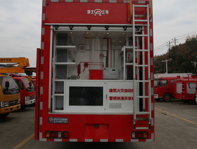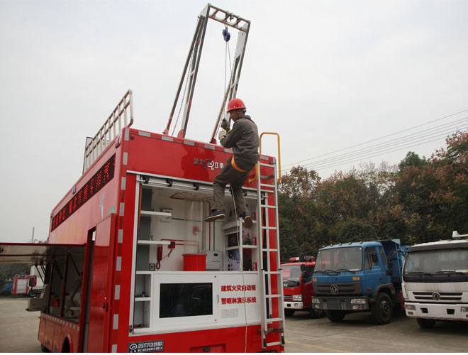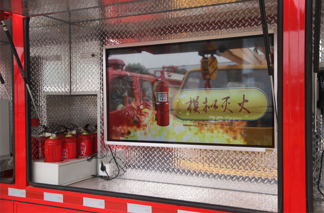 3.3、基本結(jié)構(gòu):車體側(cè)后方安裝一個(gè)廂體門,車體頂部安裝一個(gè)廂體門,配合煙霧逃生JH通道使用;車體尾部設(shè)置爬梯,供消防員上下車頂;車體前部設(shè)有抽拉式8千瓦發(fā)電機(jī)組。側(cè)面安裝P6 LED全彩屏3840mm*1920mm;車廂內(nèi)安裝控制系統(tǒng):臺(tái)式電腦,音柱: 2只60W/只 功放:360W;車廂內(nèi)部安裝煙霧逃生通道演練系統(tǒng),爬梯,上部安裝樓層結(jié)繩逃生體驗(yàn)功能;另側(cè)面安裝模擬報(bào)警訓(xùn)練系統(tǒng)、消防安全標(biāo)識認(rèn)知系統(tǒng)、電氣火災(zāi)成因試驗(yàn)系統(tǒng)、建筑消防設(shè)施模擬系統(tǒng)、火災(zāi)隱患查找系統(tǒng)。