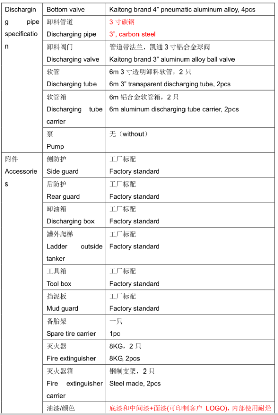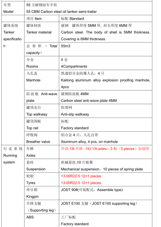 半掛55立方油罐車出口車型配置說(shuō)明: